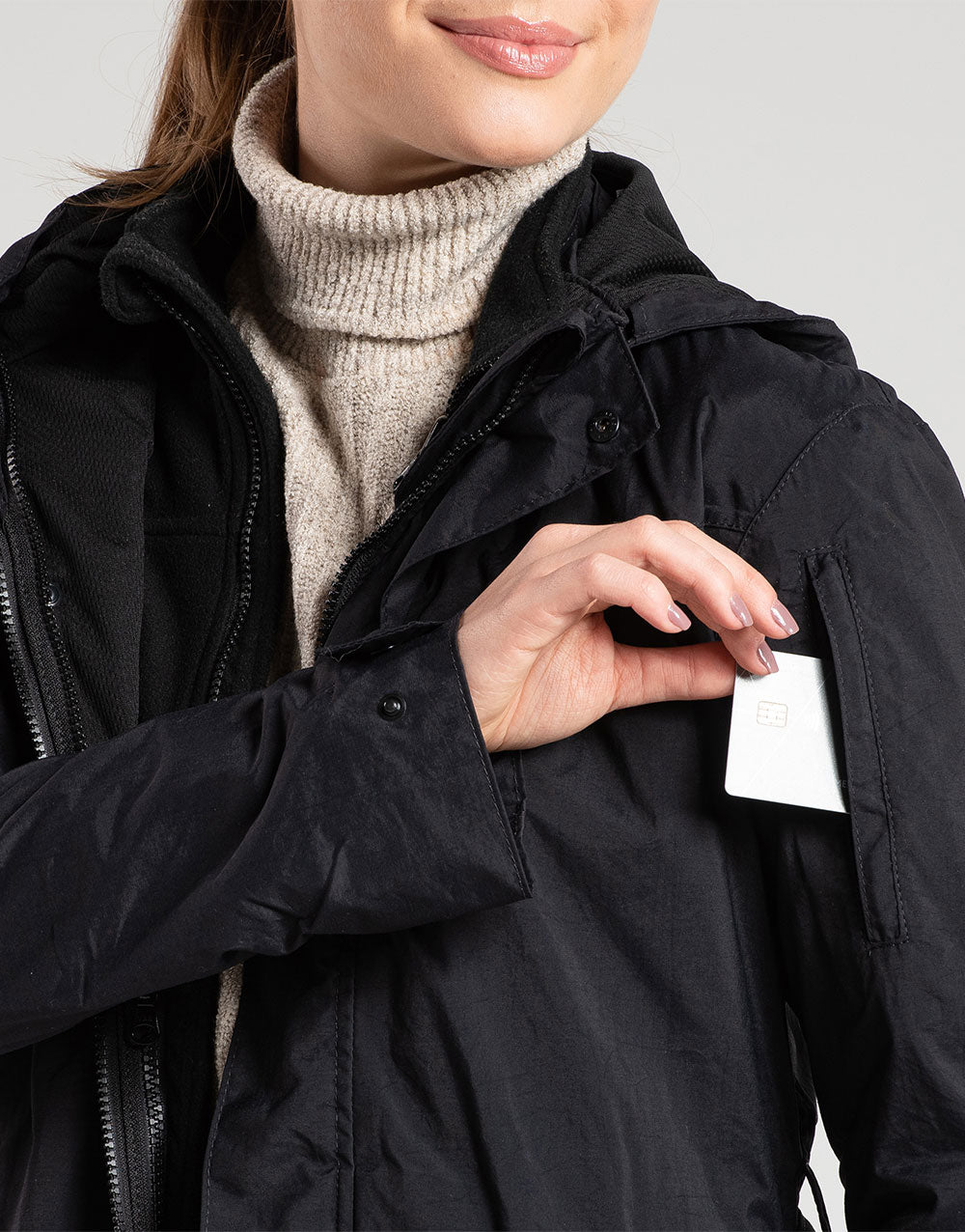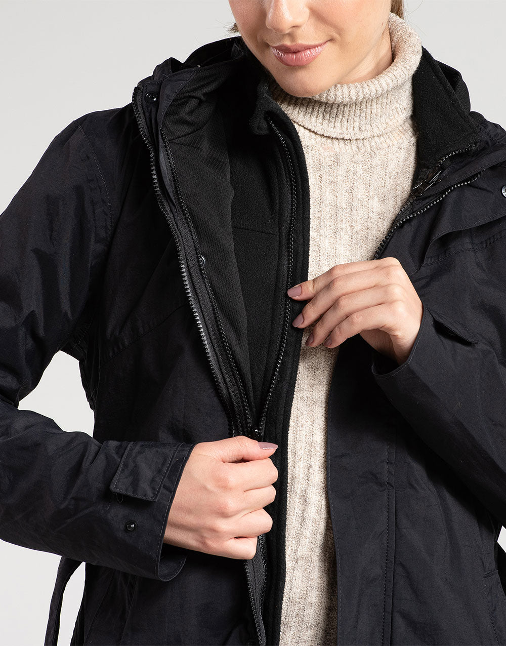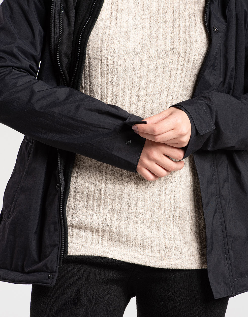 As camadas se separam - e se unem- por 2 zípers internos (um de cada lado). Além disso, na ponta das mangas há uma pressão que une as pontas do Winter Explorer.
